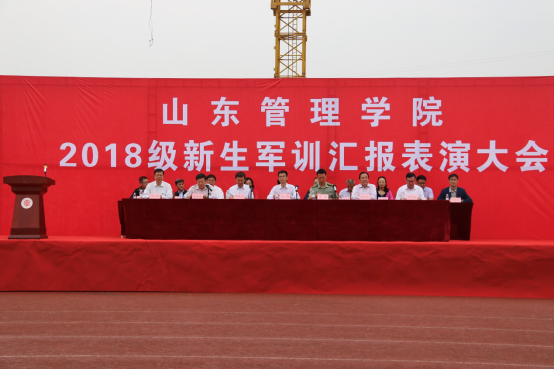 9月25日上午,山东管理学院2018级新生军训汇报表演大会在训练场隆重举行。校党委副书记、院长邹广德,军训部队领导梅潇以及各二级学院领导出席了本次大会。