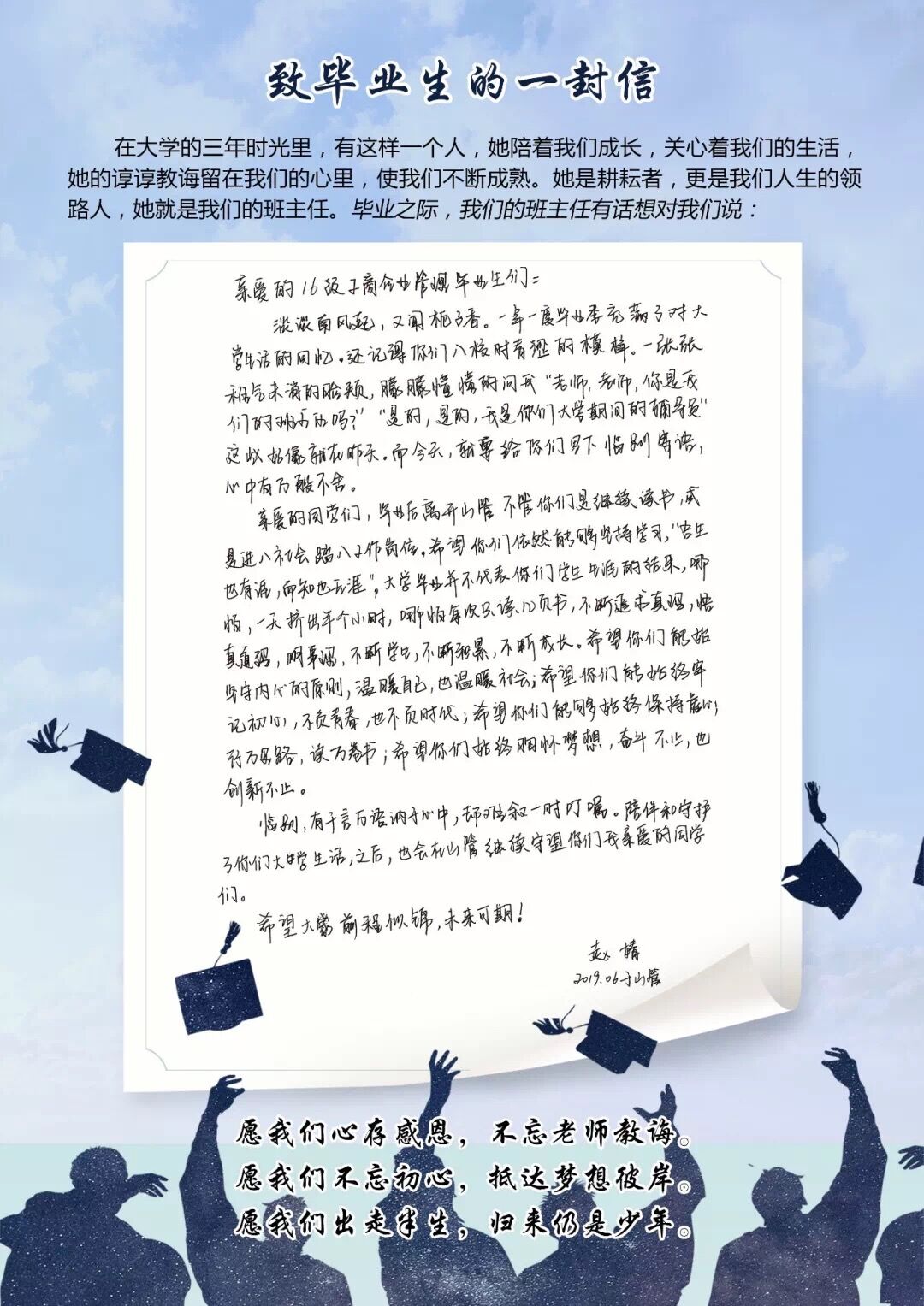 班主任手写信活动中,毕业生导师用饱含深情的语言,写下对毕业生的深情祝愿与勉励。毕业季照片征集活动中,学院收到了毕业班级精心拍出的毕业季照片,并在学院公众微信公众号上进行推送宣传。毕业生茶话会以座谈的方式,邀请工商学院的领导和老师,与毕业生代表围坐在一起,大家讨论着大学过往时光的经历与收获,谈到对毕业后的打算。老师对毕业生送出最诚挚的祝愿。