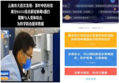 结合现下疫情,杨欣老师在公选课《茶艺》课程中补充了云南农大的首次发现:茶叶中的有效成分EGCG能够强力结合新冠病毒S蛋白,并阻断新冠病毒S蛋白与人ACE2受体的结合,差不多6个EGCG可以达到1个人类受体与病毒S蛋白结合的能力,从而有效抑制病毒繁殖,具有防治新冠状病毒感染的潜力,这一发现令人振奋,同学们纷纷叹服于茶叶的神奇魅力。基于此,杨欣老师还给同学们普及了如何科学饮茶、发挥茶的有效成分来提高免疫力的常识。“防护疫情,从我做起”,大家纷纷表示要内调外防,做好自我防护,坚守健康防线,相信这场战“疫”将迎春而胜。