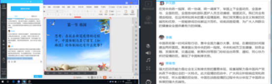 《中国客源国概况》课程的芦媛媛老师在讲授“中国的亚洲客源国之一韩国”时,引导学生思考在抗击新冠肺炎疫情的过程中,中国体制与韩国体制相比有什么优势?同学们在讨论区踊跃发言:“以人民为中心是贯穿于中国特色社会主义制度的一条红线,紧紧依靠人民群众是中国特色社会主义制度优势得以发挥的力量之源。”“强大的动员能力是社会主义制度优势的重要体现,极富凝聚力是中国共产党执政下中国社会的一大特点。”“制度的生命力在于执行,制度优势只有通过有力地执行才能充分转化为治理效能。”通过互动讨论,同学们对中国体制的优越性和韩国的政治体制特点都有了深刻的理解。