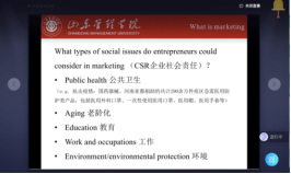 张晓旭老师本学期开展《国际市场营销(双语)》课程线上教学,将课程内容与当前全国抗击疫情的现状相结合,通过讲解企业捐款捐物的实际案例,阐明社会市场营销概念,让学生深刻体会企业家和营销人员需要承担的企业社会责任,将知识讲授与社会责任意识树立相结合。通过在线课程的弹幕功能,学生也表达和分享了对祖国抗击疫情成功的强烈信心和美好祝愿。