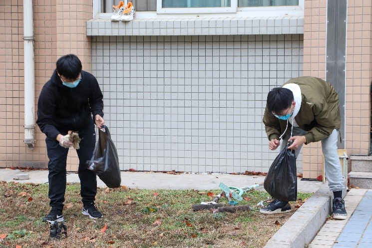 在此次校园清扫志愿服务活动中,工商学子们根据安排到指定位置集合,并佩戴好口罩落实防疫要求,组织者分发衣物、工具,并有序分配各项工作;其次,志愿者接收任务,各司其职,带好工具进行志愿清扫;之后,志愿者将清扫后的垃圾进行分类,并归到指定位置;最后,志愿者代表汇报志愿工作,并进行合影留念。