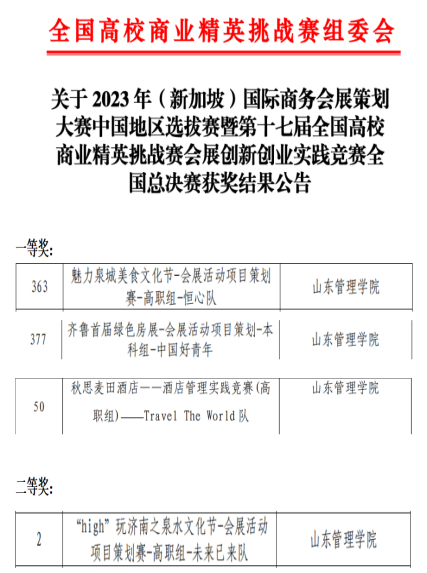 近日,由中国国际贸易促进委员会商业行业委员会、中国国际商会商业行业商会与中国商业经济学会联合主办的2023全国高校商业精英挑战赛会展创新创业实践竞赛全国总决赛圆满落幕。经过校内选拔、省赛、全国总决赛等环节,工商学院学生从来自全国各地的5200多支团队中脱颖而出,在会展创新创业实践竞赛荣获一等奖3项,二等奖1项。山东管理学院获评最佳院校组织奖。