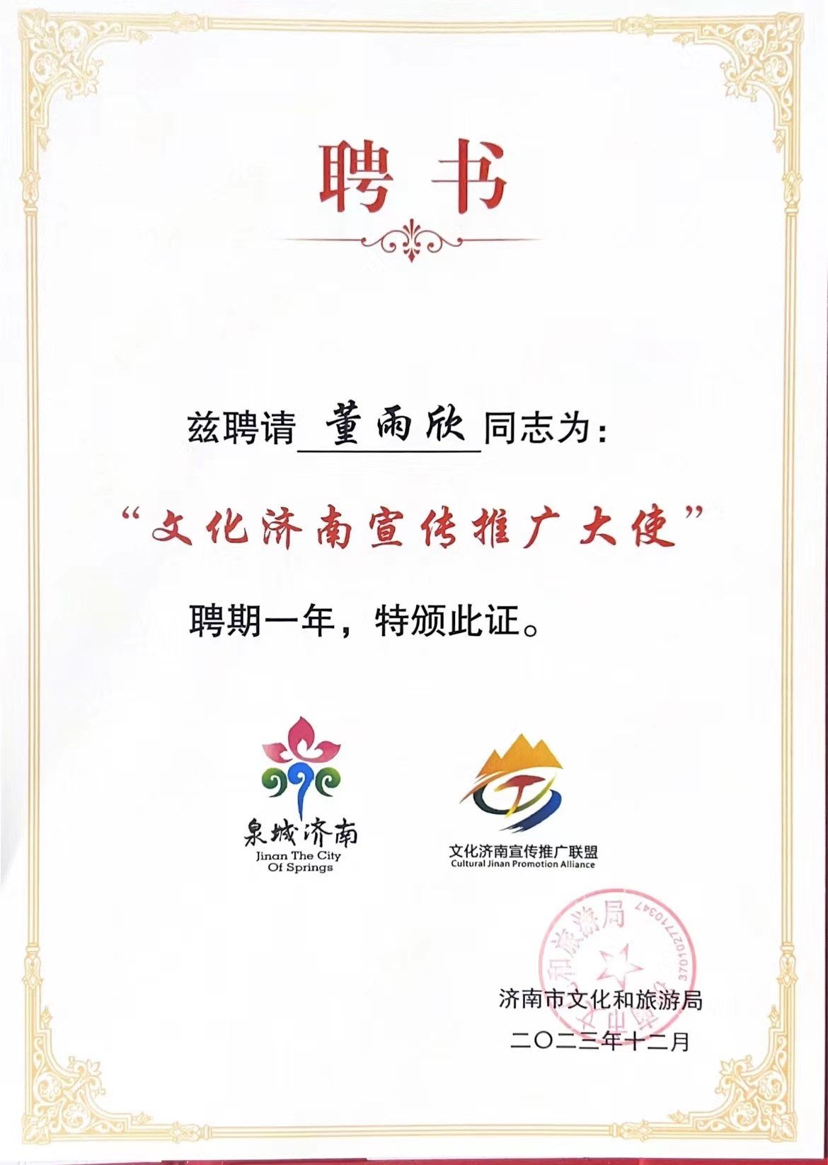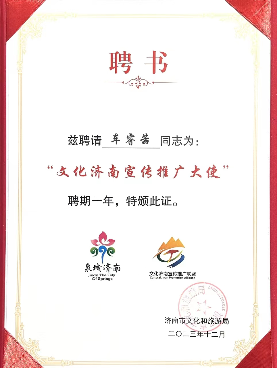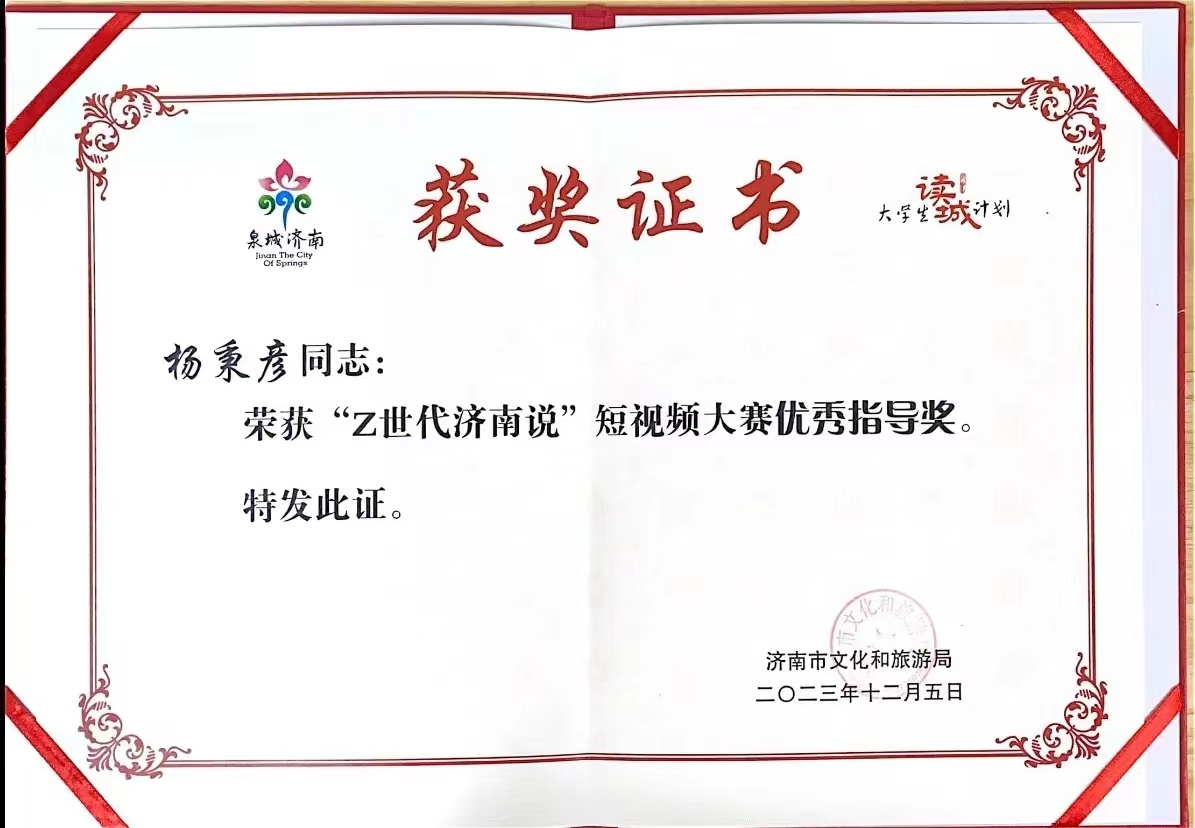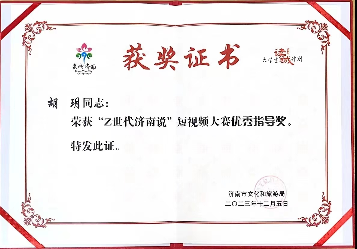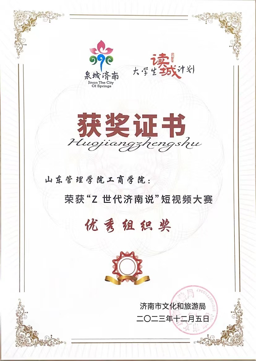 在本次活动中,山东管理学院表现出色,荣获了多个奖项。山东管理学院荣获“大学生读城计划”优秀组织奖,山东管理学院工商学院荣获“Z世代济南说”短视频大赛优秀组织奖,山东管理学院工商学院辅导员杨秉彦、胡玥荣获“Z世代济南说”短视频大赛优秀指导奖,学生董雨欣、陈奕菲、车睿茜、何雨晴、王安灏被聘请为“文化济南宣传推广大使”。多项荣誉的获得,不仅是对学校教育教学工作的肯定,也是对参赛学生及指导老师努力付出的认可。