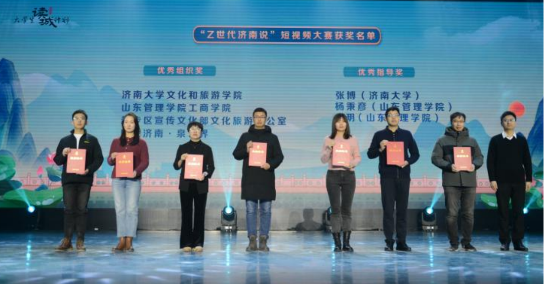 为加强全方位宣传推介,推进新媒体传播战略,实施包括千个网红打卡地、千名文旅达人、千个好客故事在内的一系列宣传活动,12月20日,大学生读城计划开放日暨“Z世代济南说”短视频大赛颁奖典礼在济南大学隆重举行,山东管理学院工商学院党总支书记李丽娜,辅导员胡玥、杨秉彦以及学生代表董雨欣,何雨晴,陈奕菲参加本次典礼。