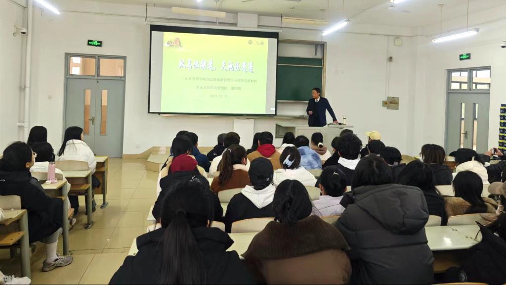 12月28日上午,泰山景区巴山管理区书记黄国强为旅游管理系学子进行《纵马踏江湖、天地任逍遥》主题讲座。