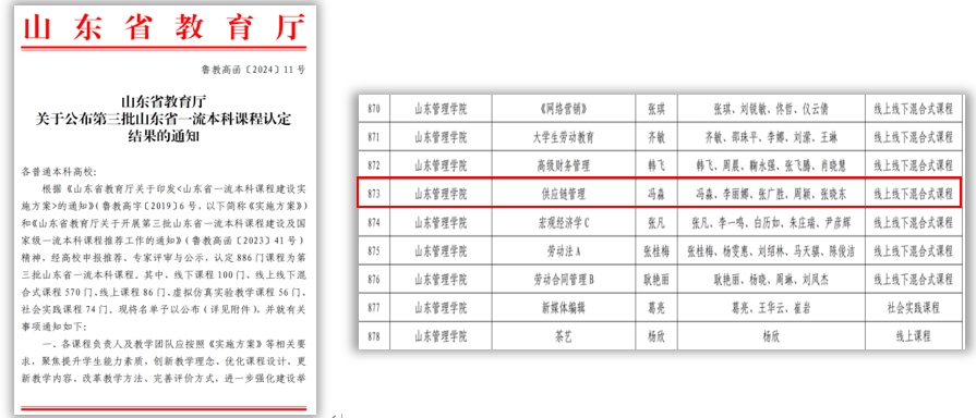 图2 冯淼作为《供应链管理》主讲教师获评山东省一流本科课程