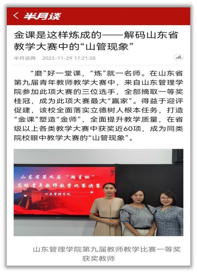 她的获奖事迹也获得了新华社主办的半月谈网题为“金课是这样炼成的——解码山东省教学大赛中的‘山管现象’ ”的报道。