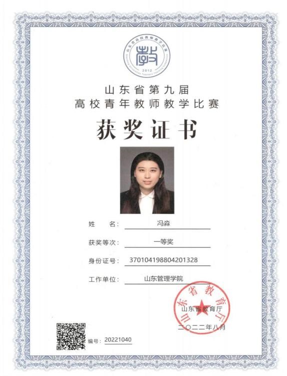 图1 冯淼荣获山东省第九届高校青年教师教学比赛一等奖