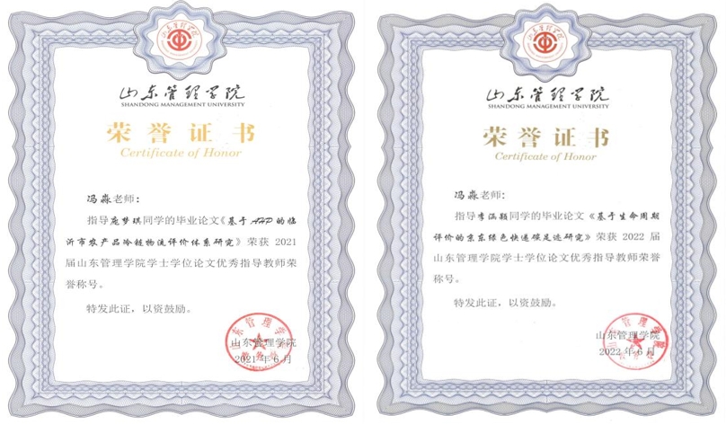 图6 冯淼连续两年获得山东管理学院毕业论文优秀指导教师