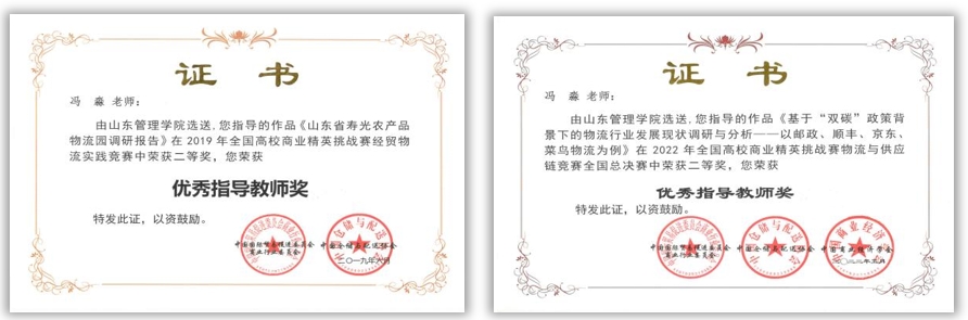 冯淼不但拥有突出的教学能力,还特别注重和学生的交流,她始终认为教师不仅要传授知识,更要培养能力和信念,使学生成长成才,平日里就注重培养学生运用所学管理知识帮助我国企业解决实际问题的能力,提升学生的应用和实践能力,鼓励学生更多参与大学生创新创业类竞赛和学科类竞赛,她从教以来共指导本科毕业论文60人次,连续两年获得山东管理学院毕业论文优秀指导教师,指导学生在《物流技术》发表学术论文1篇;指导学生荣获全国高校商业精英挑战赛物流与供应链竞赛全国总决赛二等奖2项,山东省总决赛一等奖2项,二等奖2项和三等奖4项;指导学生荣获第四届全国“互联网+”快递大学生创新创业大赛全国总决赛铜奖5项。