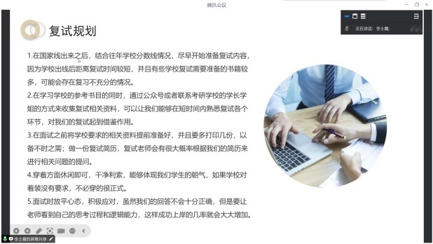 为帮助同学们明确考研方向、熟悉备考流程、提高考研能力,充分发挥朋辈互助,示范引领作用,5月29日下午两点,物流管理专业举行了线上考研经验交流会。