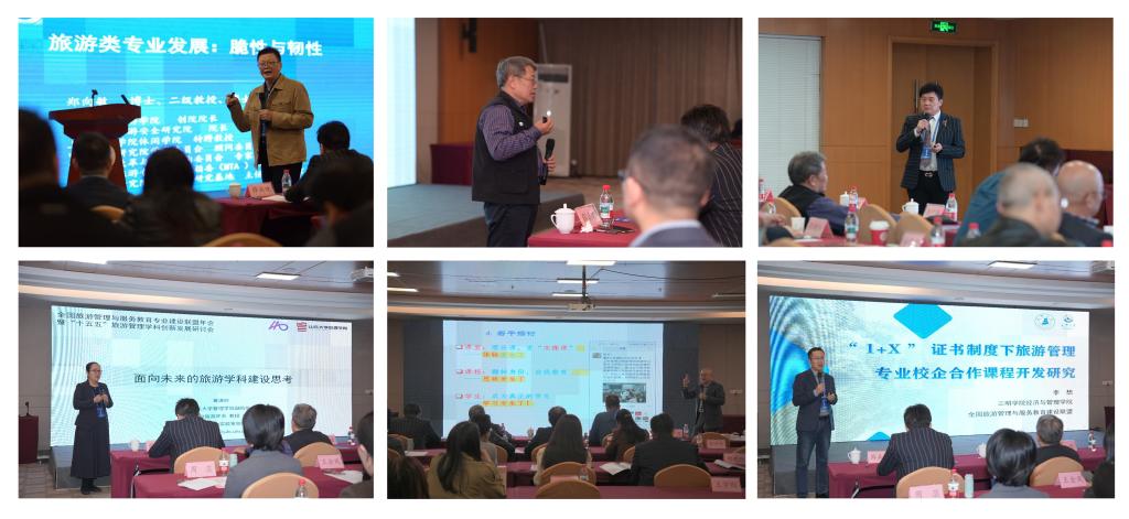 主旨报告环节,各高校专家分别以《旅游类专业发展:脆性与韧性》《关于我国旅游管理专业建设与学科发展的几点认知》《旅游管理类现代产业学院机制创新与路径选择》《从教“书”到教“学”:让课程价值“自主”实现》《面向未来的旅游学科建设思考》《1+x证书制度下旅游管理专业校企合作研学课程开发》为主题,作了主题报告和经验分享。
