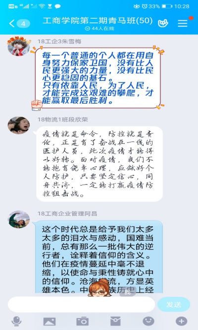 观影结束后,全体同学表示要认真贯彻落实习近平总书记关于疫情防控的重要讲话精神,向战斗在抗“疫”一线的英雄们学习,学习他们勇担使命的精神、保护生命的执着以及立足岗位的坚守。