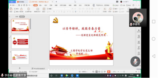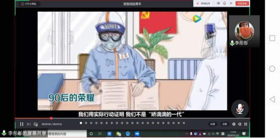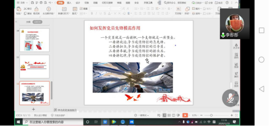 在此次党课中,李彤彤老师以一段防疫视频为开端,生动的阐述了什么是党员的先锋模范作用。李彤彤老师鼓励同学们要学习前线抗疫战士们挺身而出,冲锋陷阵的精神,以身作则,坚定理想信念,身体力行,扛起时代重任。