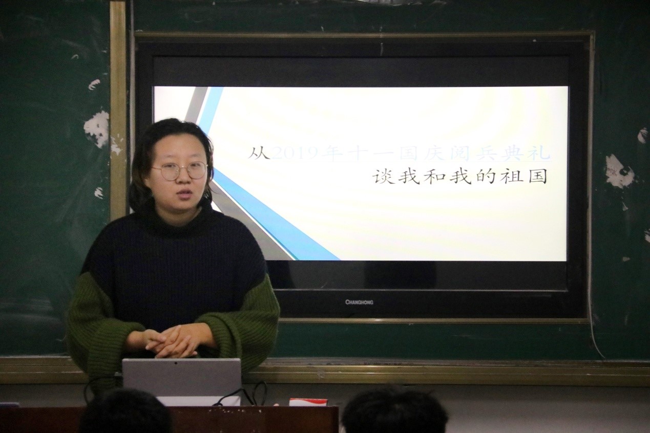 阴丽娜以中华人民共和国成立70周年阅兵式为切入点,通过阅兵规模、特色方队、新型武器、将军人数和综合保障等方面的讲解和对此,让同学们深入了解国庆阅兵庆典,感受国家建设的成就。