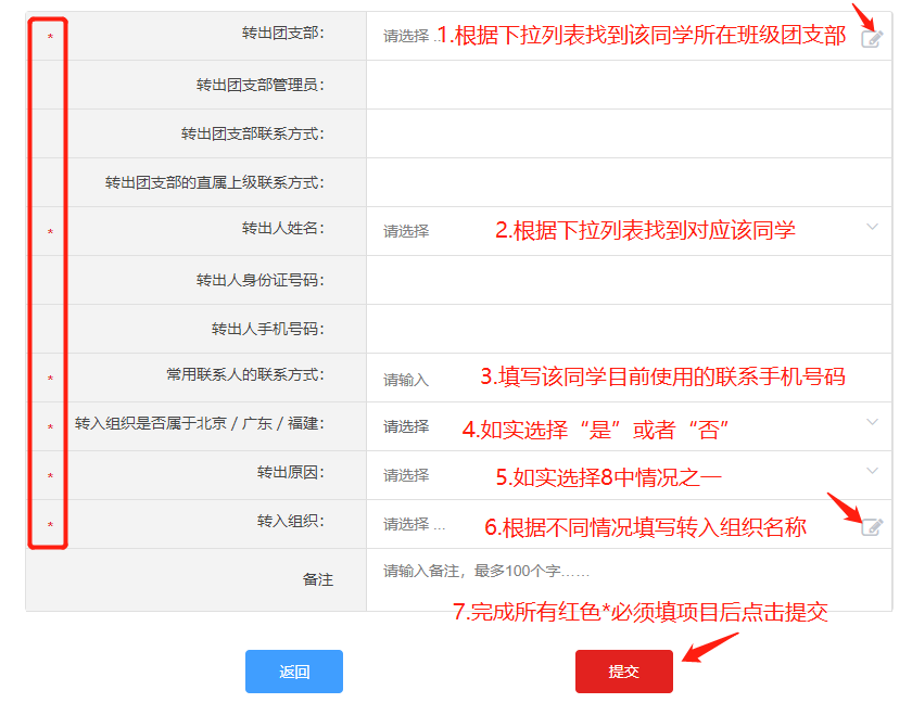 ●升学:选择转出团支部、转出人姓名、转入组织是否属于北京/广东/福建、转出原因(升学)、填写转入学校名称、转入学校所在地详细地址、转入组织。
