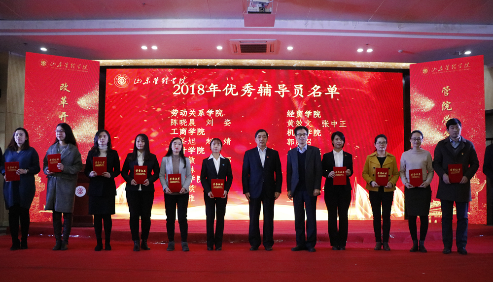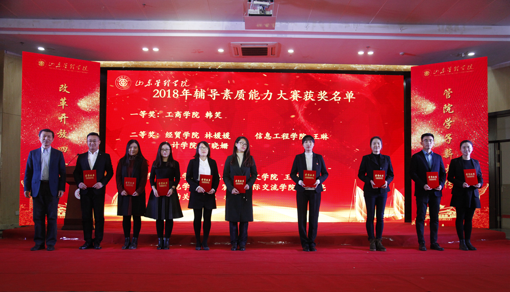 2018年工商学院学生管理工作成绩斐然,我院师生在大会上获得表彰。我院卢圣旭、赵婧老师荣获“山东管理学院优秀辅导员”称号;韩笑老师获得“山东管理学院第五届辅导员素质能力大赛”第一名,这已经是我院连续3年夺冠;阴丽娜老师获得“心理健康节优秀指导教师”称号。