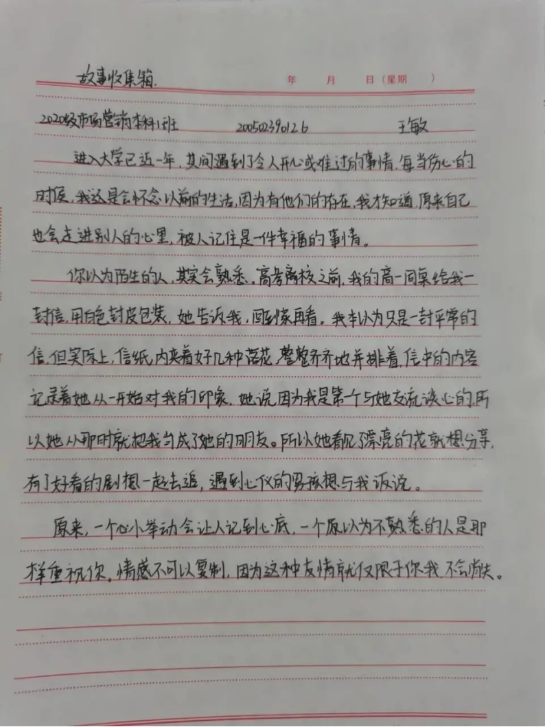 每个人都有故事,故事收集箱活动不仅给予同学们分享自己身边的故事向大家传递幸福感的机会,还展现当代大学生的青春风采,丰富了校园文化,激发了工商学子对生活对学校的热爱。