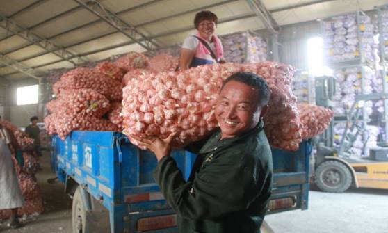 村民正在装卸成袋大蒜,脸上洋溢着笑容