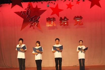 我校于2011年6月22日成功举办庆祝建党90周年红歌会活动,我院师生积极响应,认真准备,排练了《走向复兴》、《我的祖国》节目,为中国共产党90周年献礼。