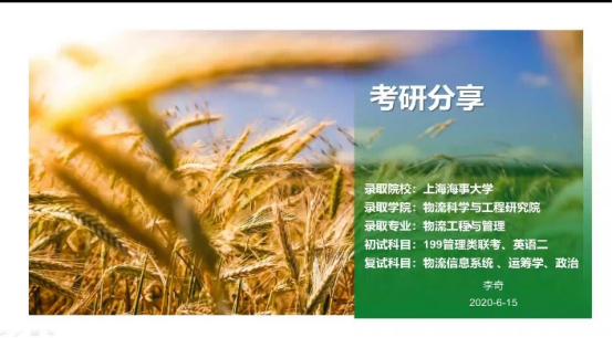 为进一步增强同学们对考研的认识,了解前沿的就业形势,增强考研斗志,帮助有意向考研的学生更好地择校、备考和合理进行时间安排,物流管理专业于6月15日举办了考研线上经验交流会。2016届考研成绩优秀的学长学姐们在本次交流会上与大家介绍当前考研形势,分析考研动态,并分享了宝贵的个人经验。
