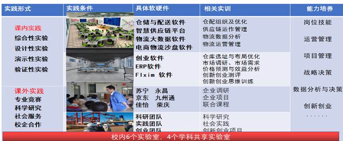 专业建有物流3D虚拟仿真实训室、智慧物流与供应链综合实训室等6个实验室,并与德州乐陵交通局、山东邮政济南公司、山东九州通医药物流、顺丰速运、京东物流、菜鸟供应链等政府和企事业单位达成合作,以满足学生实习实践需求。
